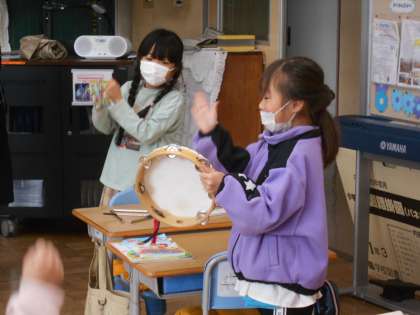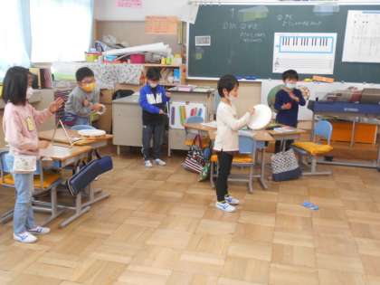 いろいろな打楽器がありますが、タイミングを合わせて、音を出します。友達との気持ちを一つにして、いい音を出していました。