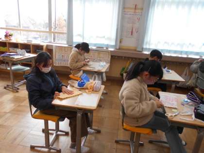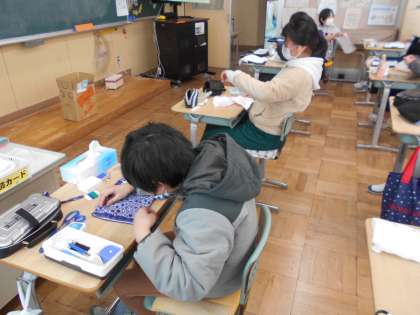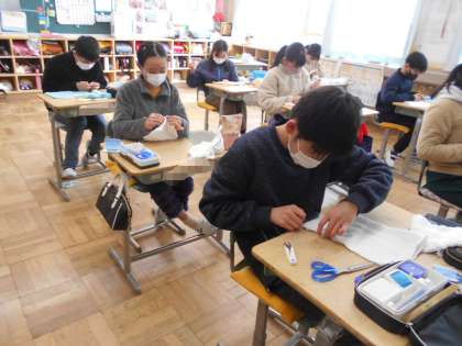 6年生が、家庭科学習した裁縫をいかして、雑巾作りをしています。