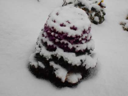 花壇に植えてある葉ボタンに雪が積もり、ミニクリスマスツリーのようになっていました。
