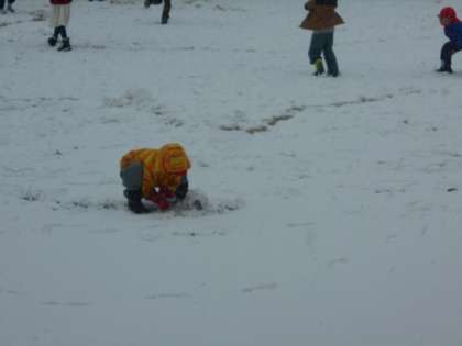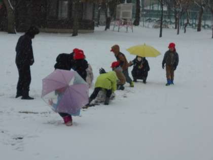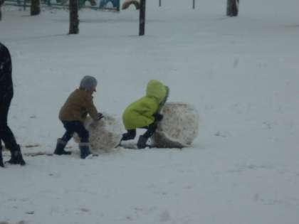 大きな雪だるまを作っています。