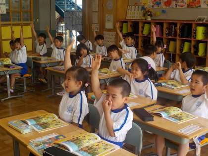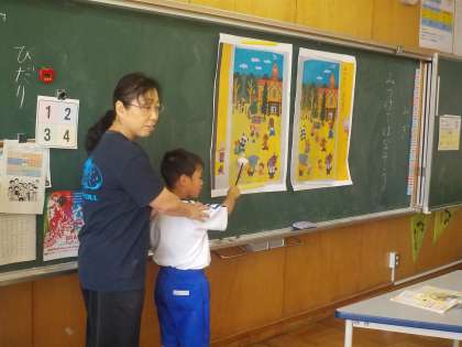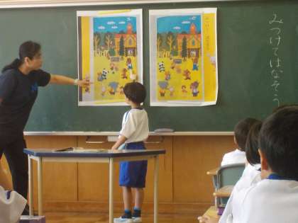 1年生の国語「みつけて はなそう」です。2つの絵の違いを見つけて、どんなことが起こったのかな、どんなふうに話をしたのかな、とお話をしています。「パンダがタヌキを手伝っています。」「ありがとう」・・見つけた人は、前に出てみんなにお話をしています。