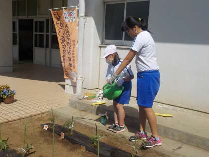 3組の畑に、トマト、キュウリ、ナスなどの野菜の苗を植えました。向田小の花壇や畑は日当たりがいいので、とても立派に植物が育ちます。夏野菜のできが楽しみです。