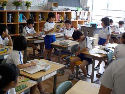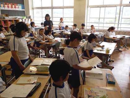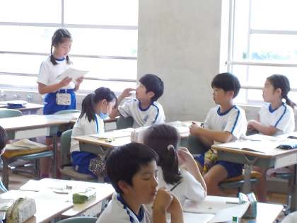国語「白いぼうし」の読後感想を4年生の子どもたちが発表しています。夏みかんやちょう・女の子のこと等、学習を通してじっくり考えたことを自分の言葉で表現し、友達に堂々と伝えています。どの子も授業に集中している様子が、発表したり、友達の発表を聞いたりする態度から伝わってきます。