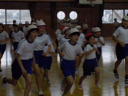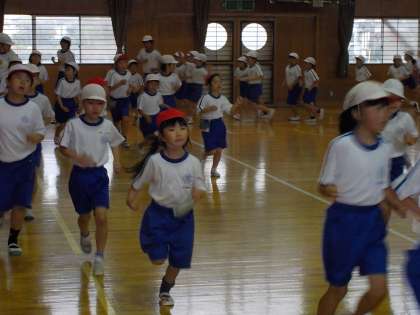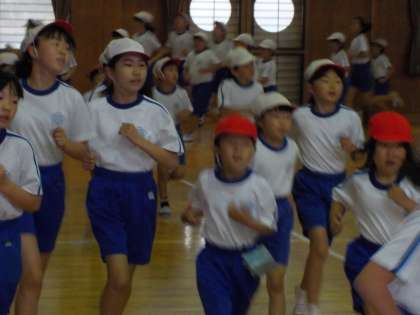 雨の朝は、体育館で一曲走ろう! を行います。目が回りそうな勢いで元気に走っています。