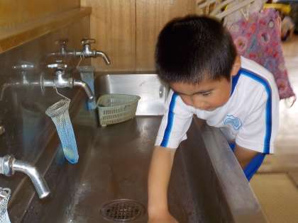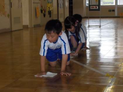 今朝は日課を変更して、朝清掃を実施しました。入学して1か月余りが過ぎて、1年生もすっかり清掃がうまくなりました。床を丁寧にふいたり、流しの掃除や下駄箱の掃除も道具を上手に使ったりして清掃をしています。