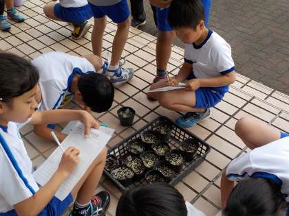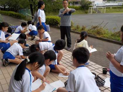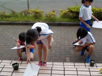 4年生が昇降口に出てきて、ヘチマの観察をしています。既に双葉になっていますが、観察してスケッチをかいています。さっと特徴をとらえてかく人もいれば、じっくりと目を向けてかいている人もいます。ヘチマの生長も早く育つものあれば、ゆっくり芽を出すものもあります。みんな、それぞれの育ち方をしていますね。