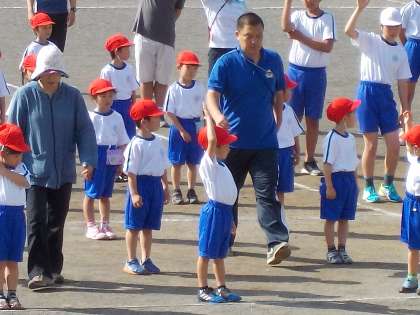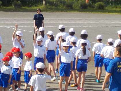 朝運動の日の今日は、体操の隊形になる練習からです。体操の隊形に開くとは、基準の人に合わせて縦の列・横の列をそろえることですが、周囲に気を遣い、合わせようという気持ちが必要です。集団行動の意味は、ここにあります。他の人と生活する中で、ルールや気遣いは欠かせないものだからです。1年生もそんなことを学びながら動いています。