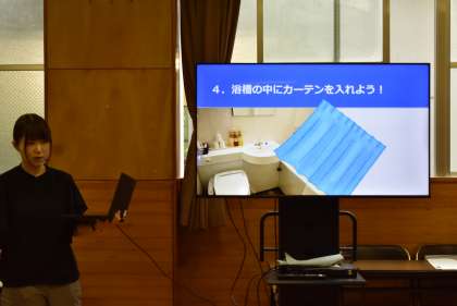 ホテルのお風呂の使い方を学んでいます。修学旅行まであと1ヵ月ですね。
