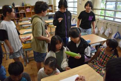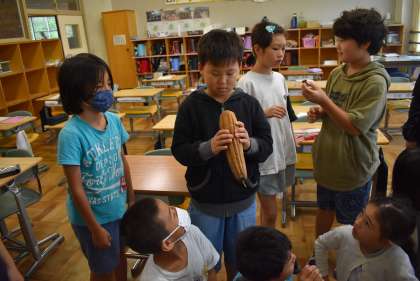 まずは、茶色のヘチマと緑のヘチマを触ってみましょう。どんなかな。