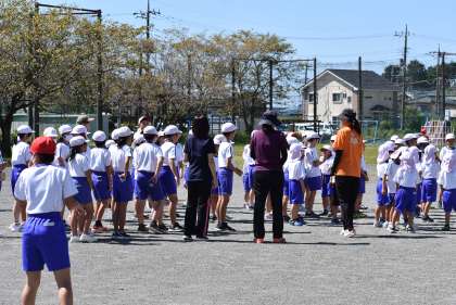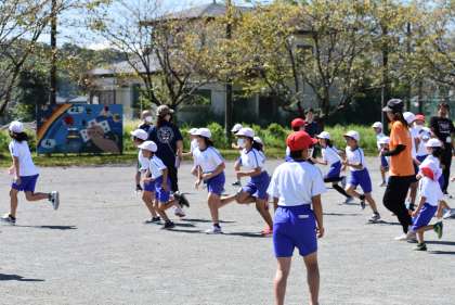 今日は「こおりおに」をしました。みんなに走り回って運動してもらうためです。赤い帽子の6年生が鬼になります。