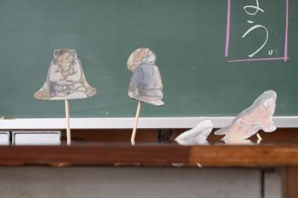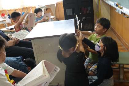 2年生はヤマトノオロチのお話を、ペープサートを使って劇にしています。役割も決まって、練習中。動きをつけたり、せりふの読み方を工夫したり。完成が楽しみです!