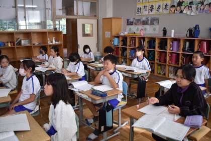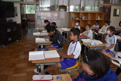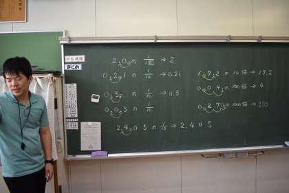 小数点の動き方が板書されています。だんだん難しくなっていきますね。