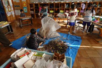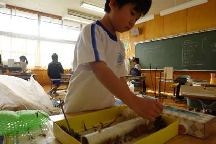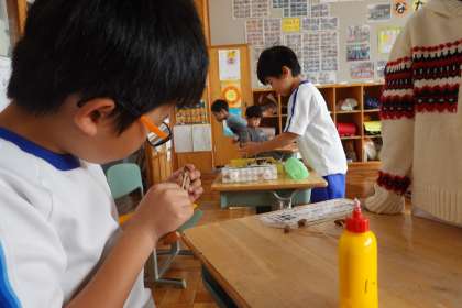 1年生は生活科で秋をつかったおもちゃづくりをしています。どんぐりでコリントゲームをつくったり、落ち葉を飾ったすてきな衣装をつくったりして、創造力が育まれています