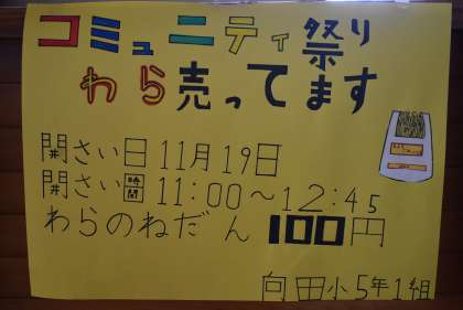 今度の日曜日は、コミュニティ祭です。お米を収穫した5年生が、藁を売ります。裾野市の袋にいっぱい詰め込んで100円です。ぜひ、ご購入にご協力ください。