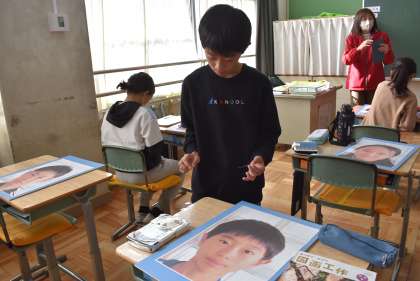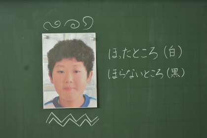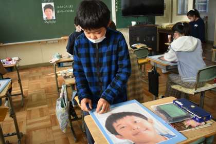 自分の顔を版画で表現していきます。板の上に自分の写真を置き、場所を固定します。