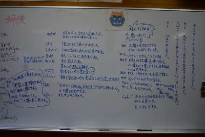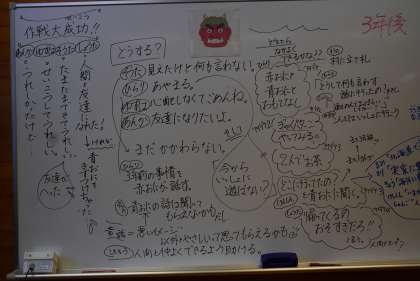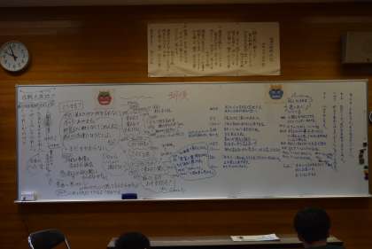 担任の先生たちが、赤おにと青おにの意見をそれぞれ板書しました。あまりに多くて間に合わない、書ききれない状況でした。よく考えましたね。