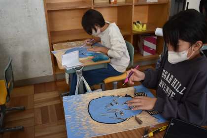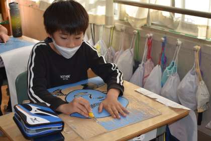 5年生にもなると、彫刻刀で怪我をする児童にいなくなります。慣れてきて、上手に使えていますね。