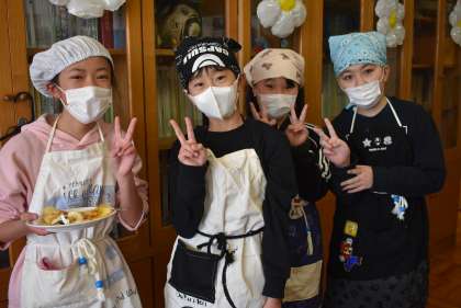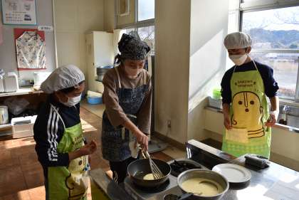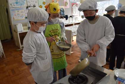焼きはじめに「緊張するなー」と、みんな慎重です。でも、上手に焼けています。
