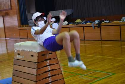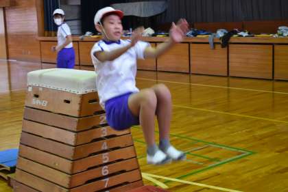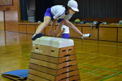 高い跳び箱で、開脚跳びだけでなく、台上前転、抱え込み跳びにも挑戦です。