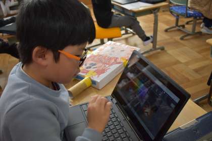 箱で作った動物。上手にできましたね。作品カードをパソコンで作成しています。