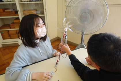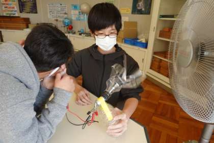 理科の電気の単元では、個々の課題に合わせて実験や学習を一人ひとり進めています。風力を発電機をつくる子たちもいます。風の角度が、難しいようです