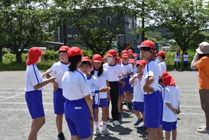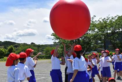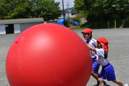紅組は、大玉運びの練習です。玉を転がす人数が4人から2人に変わりました。ルール変更ですね。4人の時は、玉に触れない人がいましたものね。