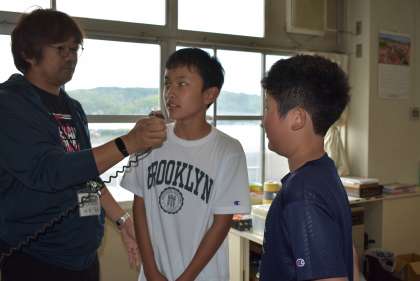 赤白のリーダーがね中休みの練習計画を放送しています。