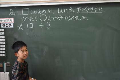 □このあめを、1人に3個ずつ分けると、ぴったり〇人で分けられました。