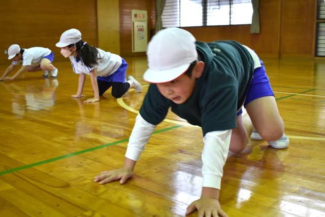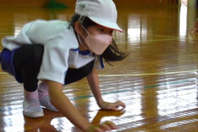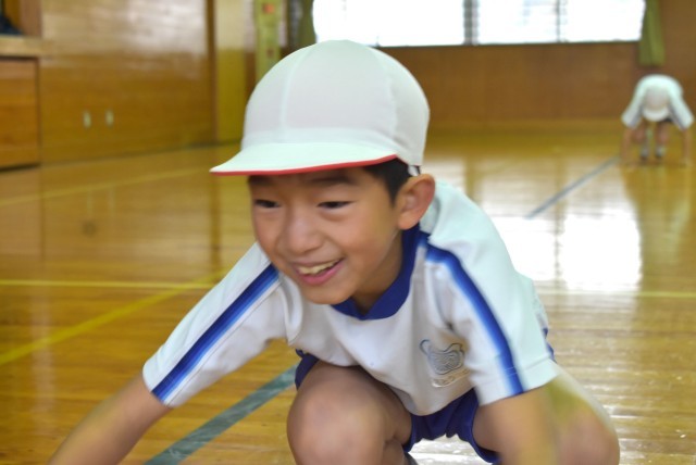 跳び箱を跳ぶような動きの、きつそうな運動をしています。