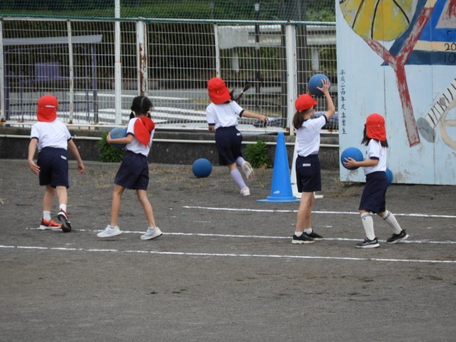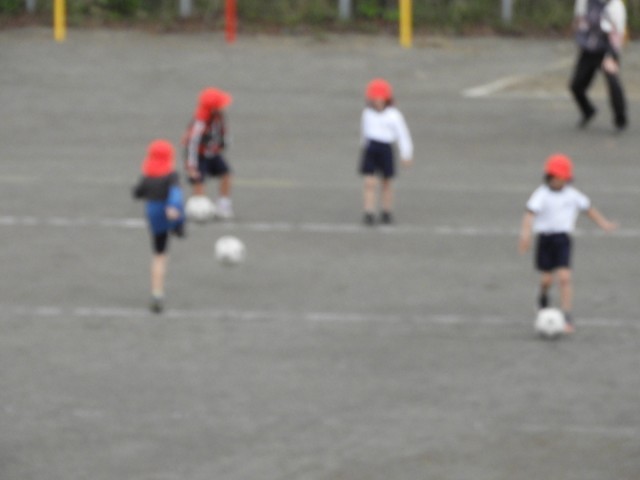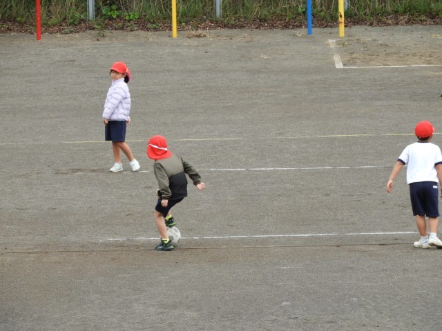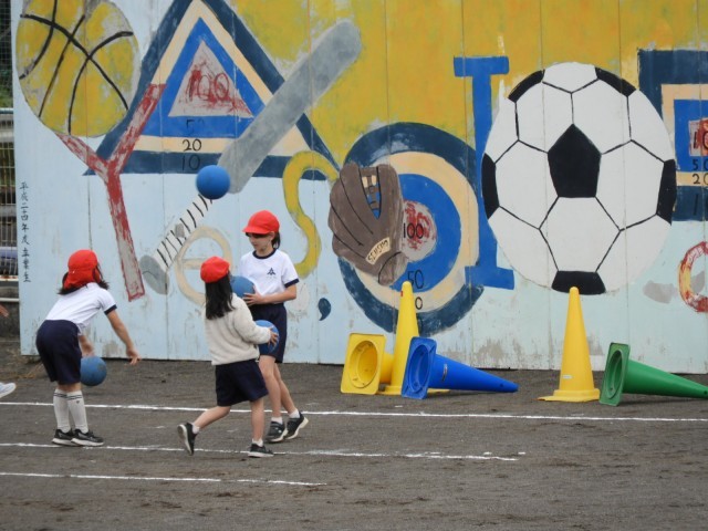 運動場では、1年生がボール蹴りを2年生がボール投げの遊びを楽しみました。