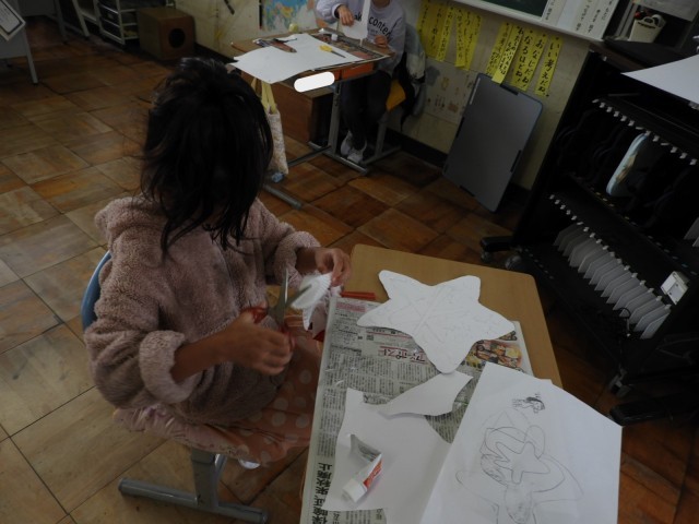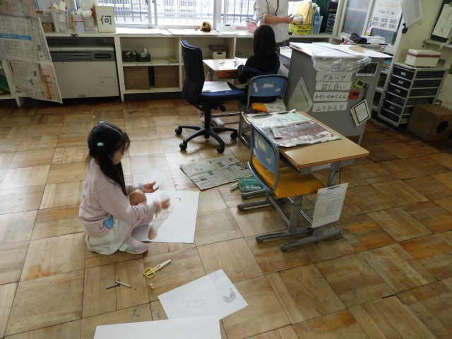 2年生の図工では、紙版画を作っています。果物用のネットやフルーツキャップなど、やいろいろな素材を組み合わせて貼り付けています。出来上がりが楽しみです。