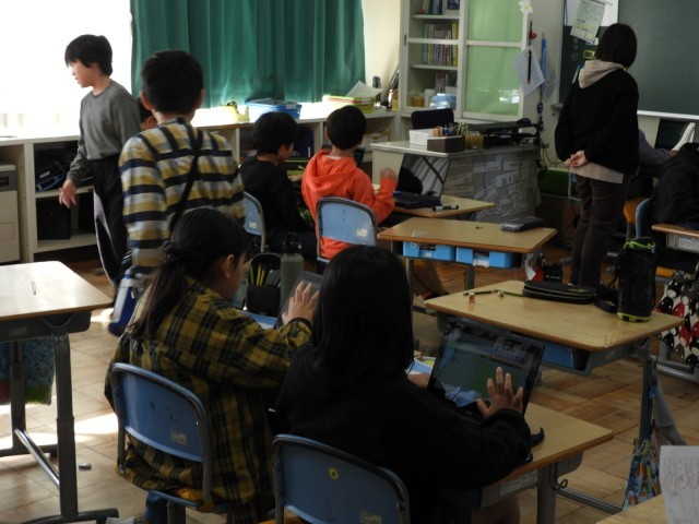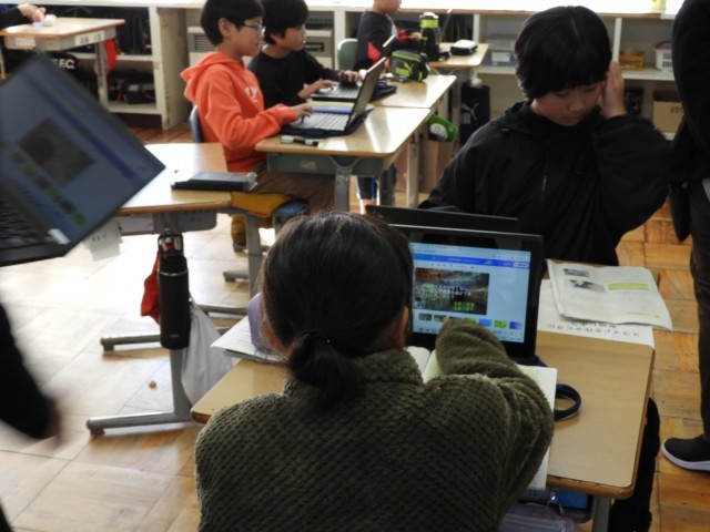 4年生は深良用水について調べ学習をしています。タブレットを使い、友達と協力して取り組んでいます。