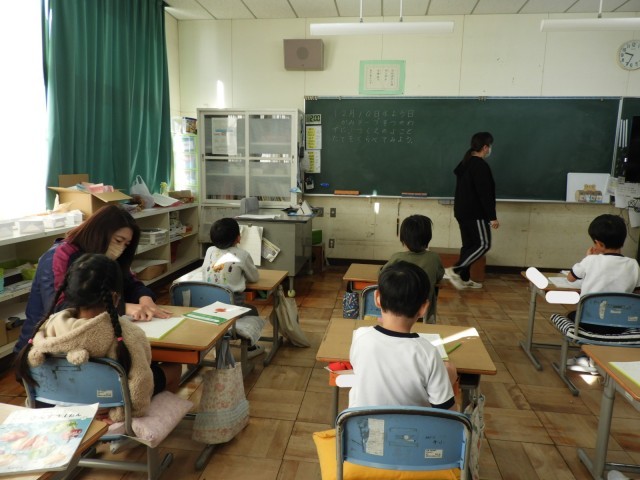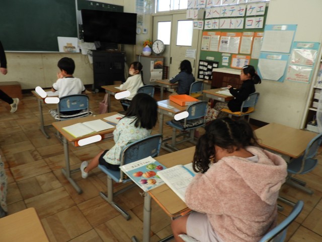 1年生は、机の縦と横の長さを紙テープで使わずに比べる方法を探しました。