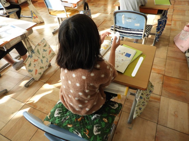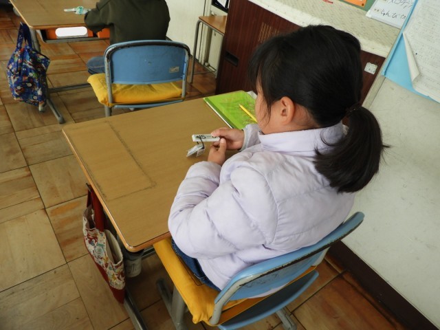 1年生は、計算カードを使って足し算や引き算の練習をしています。時間内に解ける問題数が増えています。