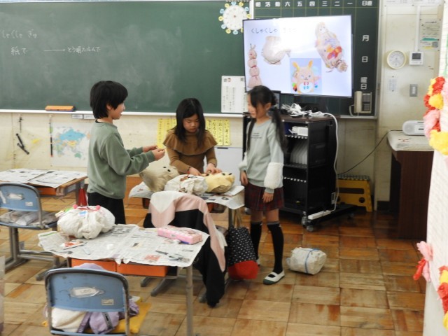 2年生は、図工で作品作りに取り組みました。様々な素材を「くしゃくしゃ、ぎゅ」して、楽しい作品を作りました。