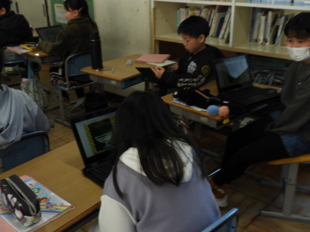 4年生の外国語活動では、フルーツパフェに乗せるものを友達に英語で質問し、タブレットを使って好きなフルーツパフェの完成を目指しました。