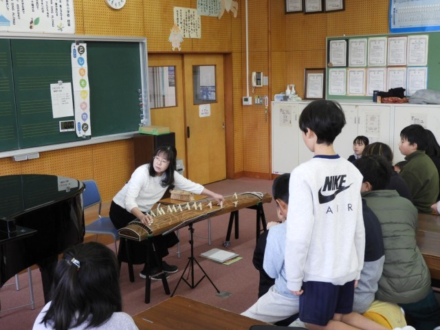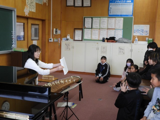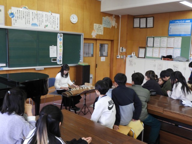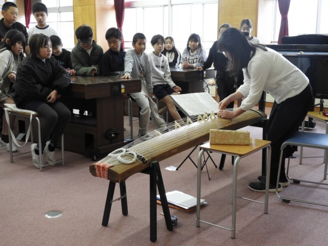5年生の音楽では、千福が丘にお住まいの方を講師に招き、筝の演奏を聞いたり実際に演奏を体験したりしました