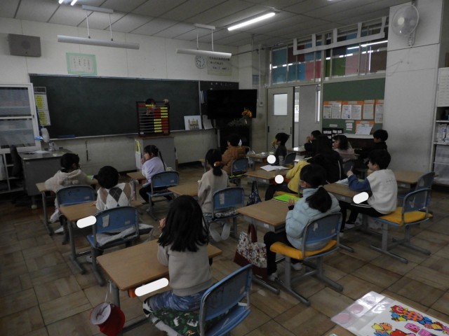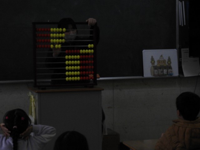 1年生は百玉そろばんを使って、みんなで2とび5とびなどの復唱をしました。