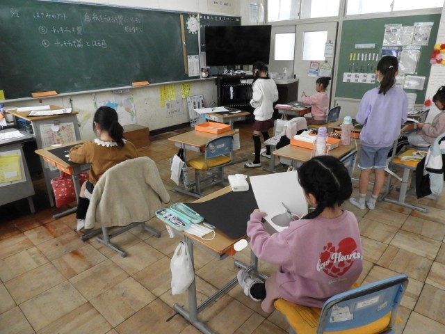 2年生は「はさみでチョキチョキして形を作ろう」の学習で、はさみのアートに挑戦しました。