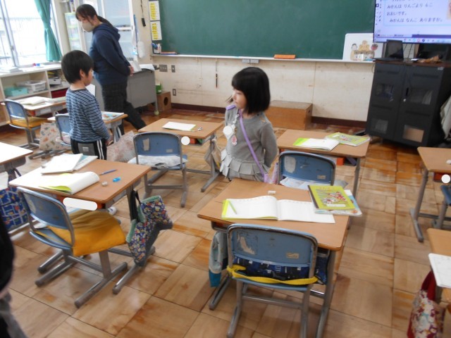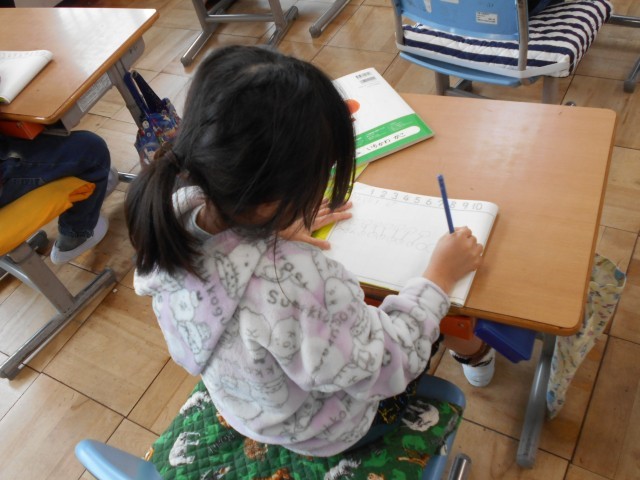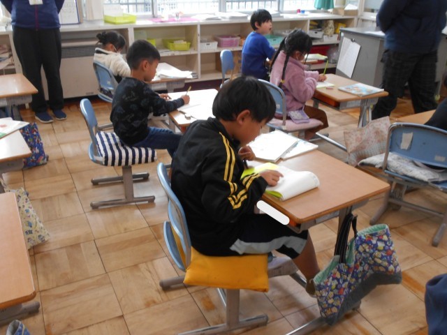 1年生は、算数の文章問題を図に表して考えました。図のかき方を皆で見合い、友達のかき方の良さを見つけました。