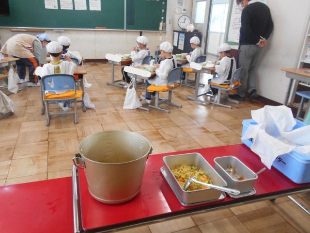 今日から給食が始まりました。1年生にとっては、小学校での初めての給食になります。今日の献立は、むぎごはん、チキンカレー、フレンチサラダ、ふくじんづけ、牛乳です。おかわりをする子も多く、皆おいしく給食を食べました。