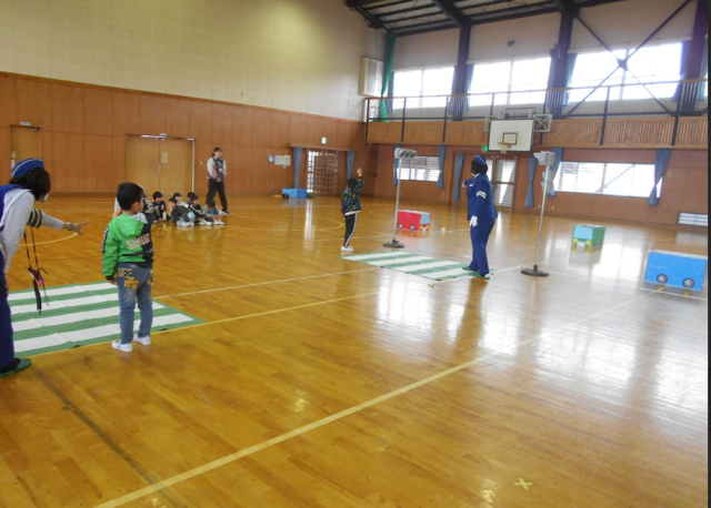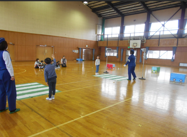 体育館に移動し、実際に横断歩道のある道路の歩き方、横断歩道での確認の仕方を一人ずつ挑戦しました。