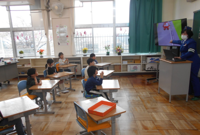 最初は、交通安全指導員さんの話を聞きながら、道路をあるくときに、どんなことに気を付けていったらよいのか?考えながら学びました。