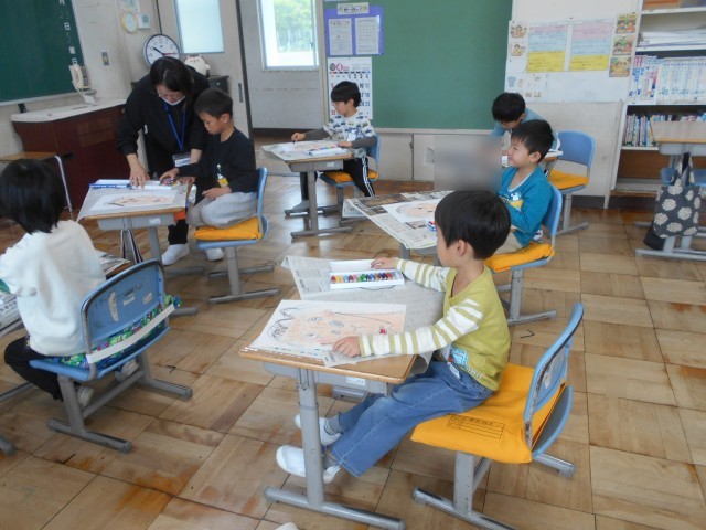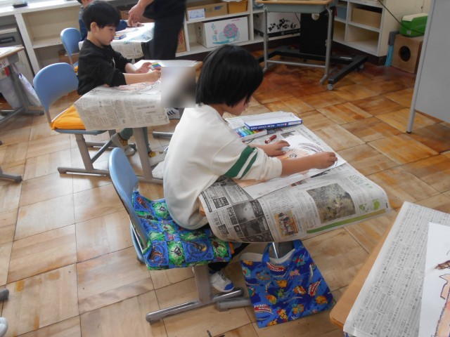 クレヨンを使って、画用紙いっぱいにダイナミックにそれぞれ描いていました。