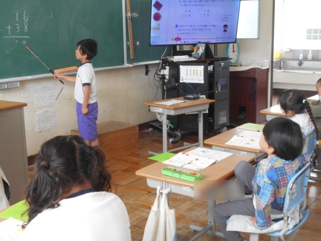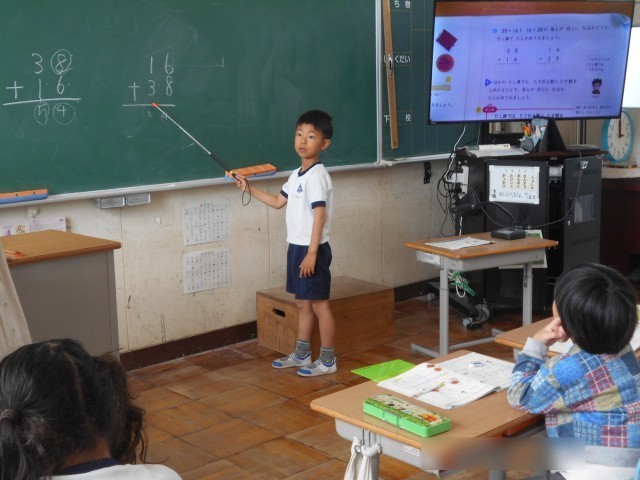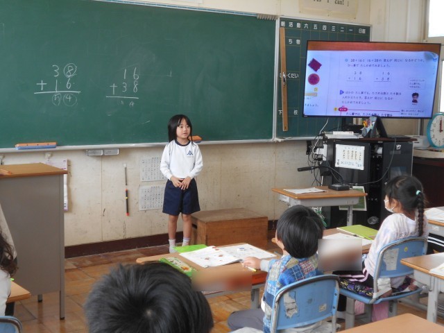 2年生の算数の学習では、たしざんの順番を入れ替えて計算をしても答えは変わらないか?を考えていました。