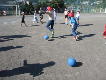 1.転がしドッジボール。写真を見てください。思っている以上にエキサイティングな球技です。