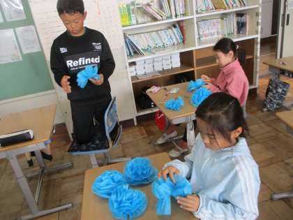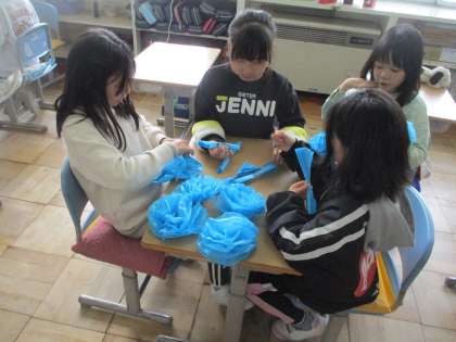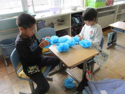 3年生が、花を作ってくれています。全校児童が関わる行事で使うものですが、どの行事で使うかはないしょにさせてくださいね。