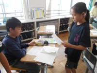 5年生の外国語の授業では、前回作成したカードを、英語で自己紹介しながら交換をして...