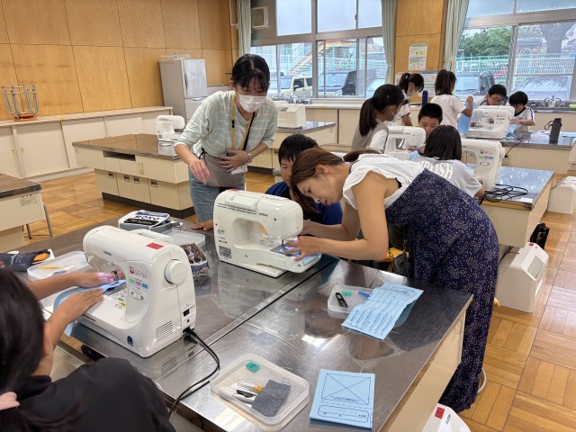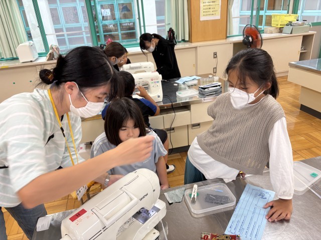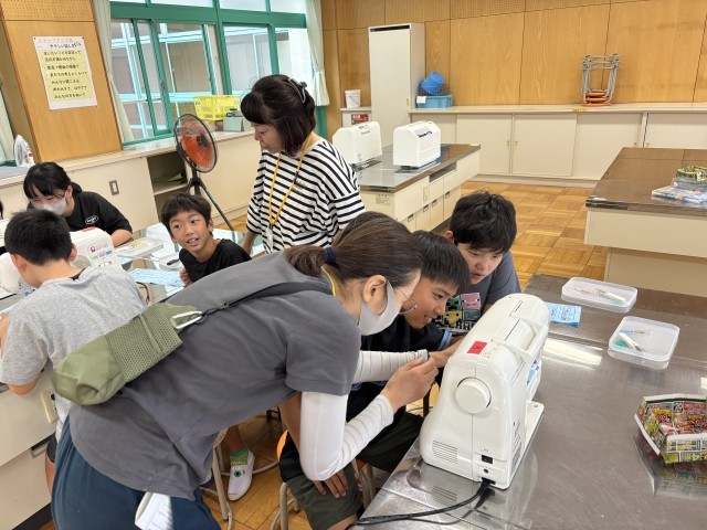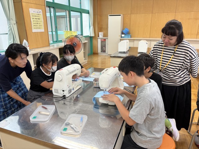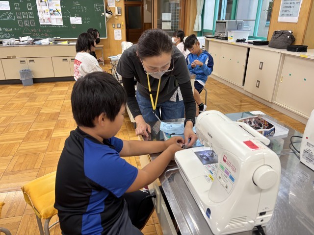 5年生が家庭科で初めてのミシンに挑戦、ミシン(図書バック)サポーターの皆さんが来て、ミシン操作のサポートをしてくださいました。