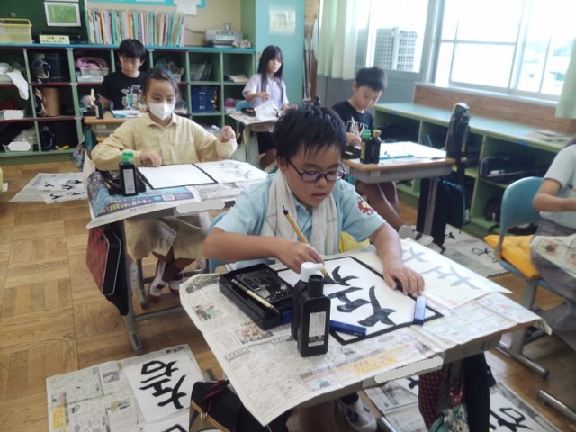 書写で「左右」を書きました。お手本をしっかりと見ながら、今日のめあての「筆順に気をつけて書く」に真剣に取り組むことができました。